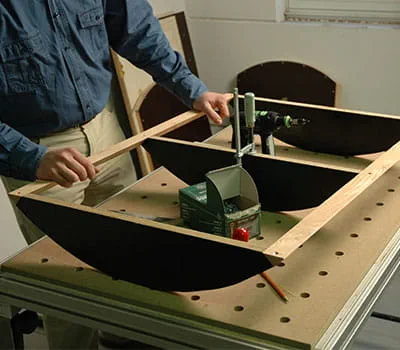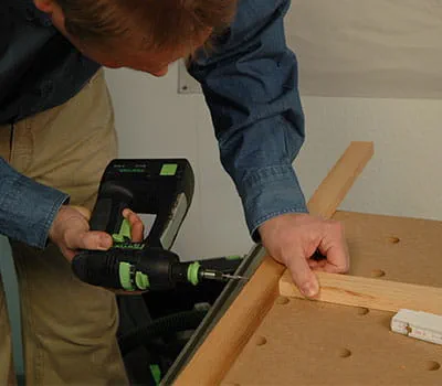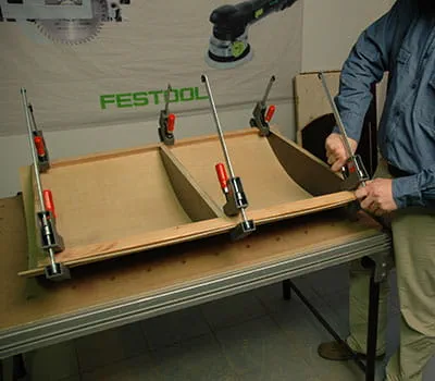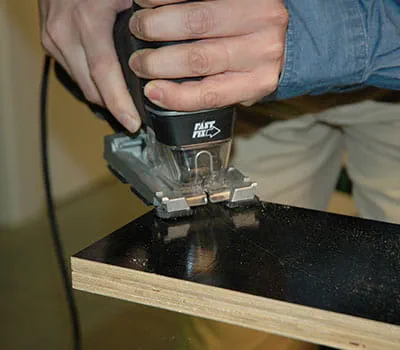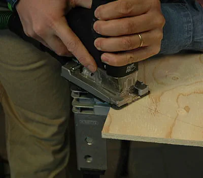 Płyty ze sklejki przyciąć na wymiar zgodnie ze specyfikacją w wykazie materiałów. W przypadku samodzielnego docinania poszczególnych płyt najłatwiej jest położyć na podłodze łaty jako podpory, a następnie za pomocą zagłębiarki i szyny prowadzącej przyciąć płyty na wymiar. Okazało się, że sensownym rozwiązaniem jest rozpoczęcie pracy od budowy dwóch ścian bocznych