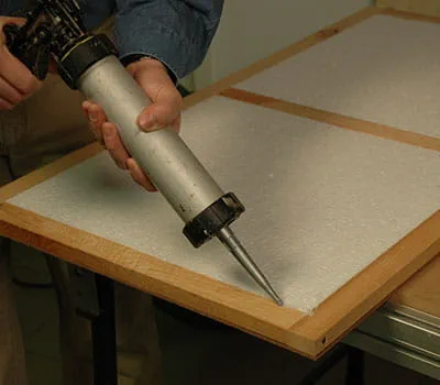 W celu ułatwienia późniejszego dokładnego pozycjonowania ważne jest zaznaczenie występu dachu. Do klejenia ponownie używamy kleju poliuretanowego. W tym kroku roboczym należy pracować z pomocą dwóch osób. Wskazane jest również wcześniejsze prześledzenie całego procesu „na sucho” (bez kleju). Nanieść klej na wsporniki dachowe i przymocować okładzinę do jednej z zewnętrznych krawędzi.