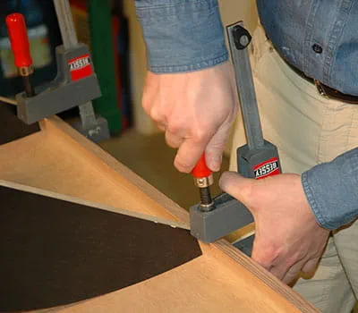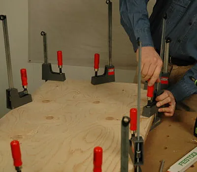 Przetoczyć konstrukcję nośną, naciskając na okładzinę, i zamocować ją za pomocą ścisków, najpierw na środku, a następnie na drugiej listwie zakończeniowej. W celu uzyskania odpowiedniego rezultatu należy zastosować możliwie jak najwięcej zacisków. Jeśli po wyschnięciu nadal widoczne są szczeliny, należy je uszczelnić wewnątrz dachu silikonem.