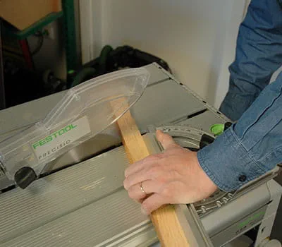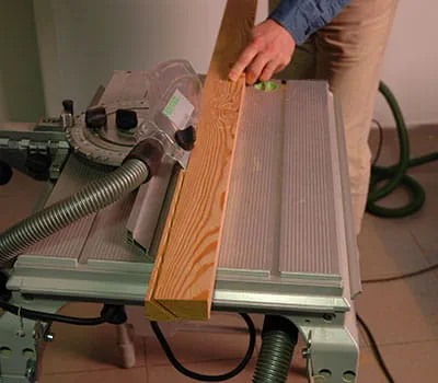 W celu uzyskania precyzyjnej krawędzi cięcia należy ustawić skok wahadłowy wyrzynarki w pozycji 1. Za pomocą stolikowej pilarki tarczowej przyciąć na długość dachowe listwy wykończeniowe pod skosem. Przy wykonywaniu cięć wzdłużnych w drewnie litym należy bezwzględnie używać grubego brzeszczotu. Za pomocą stolikowej pilarki tarczowej przyciąć listwy na długość.